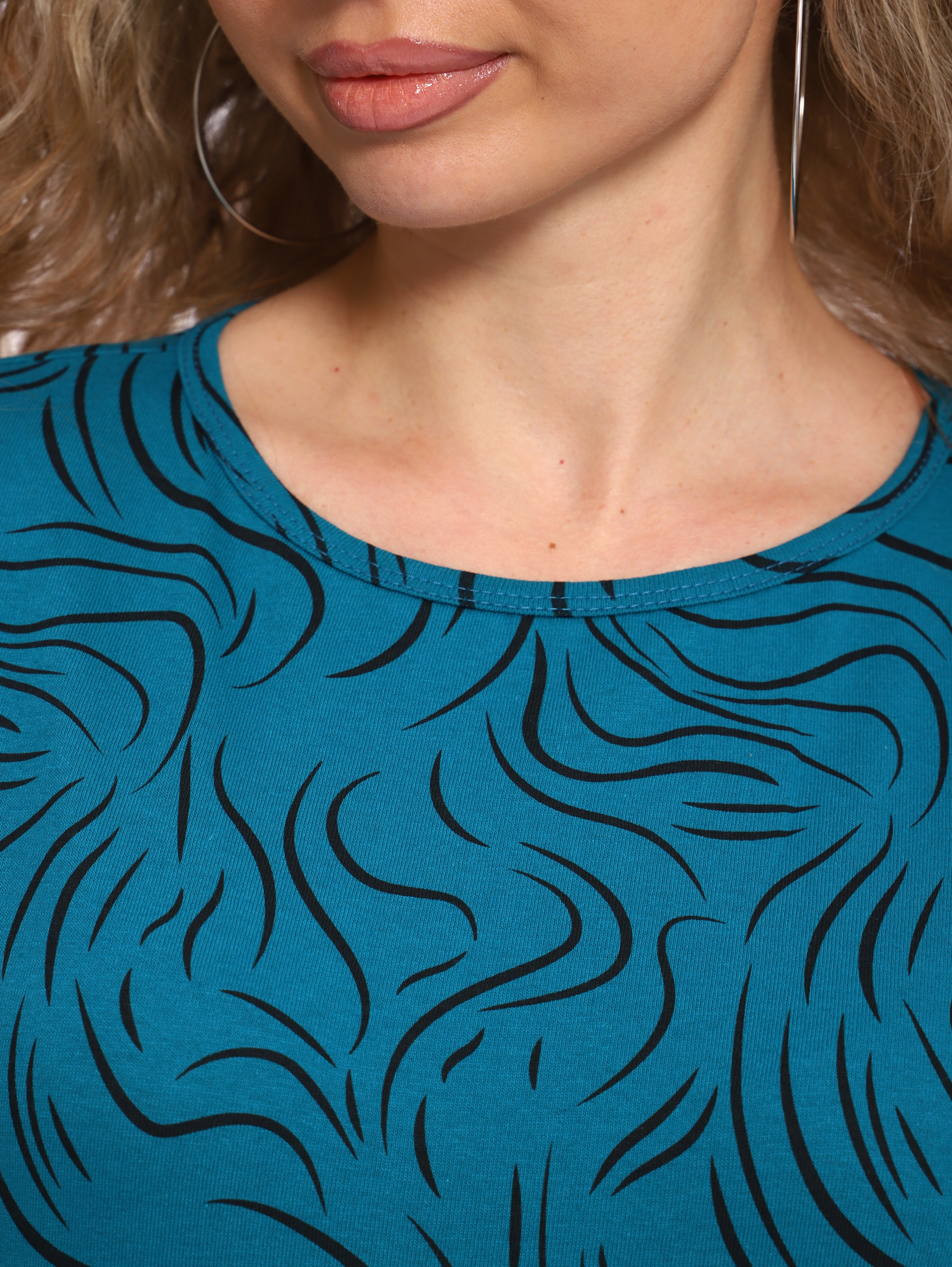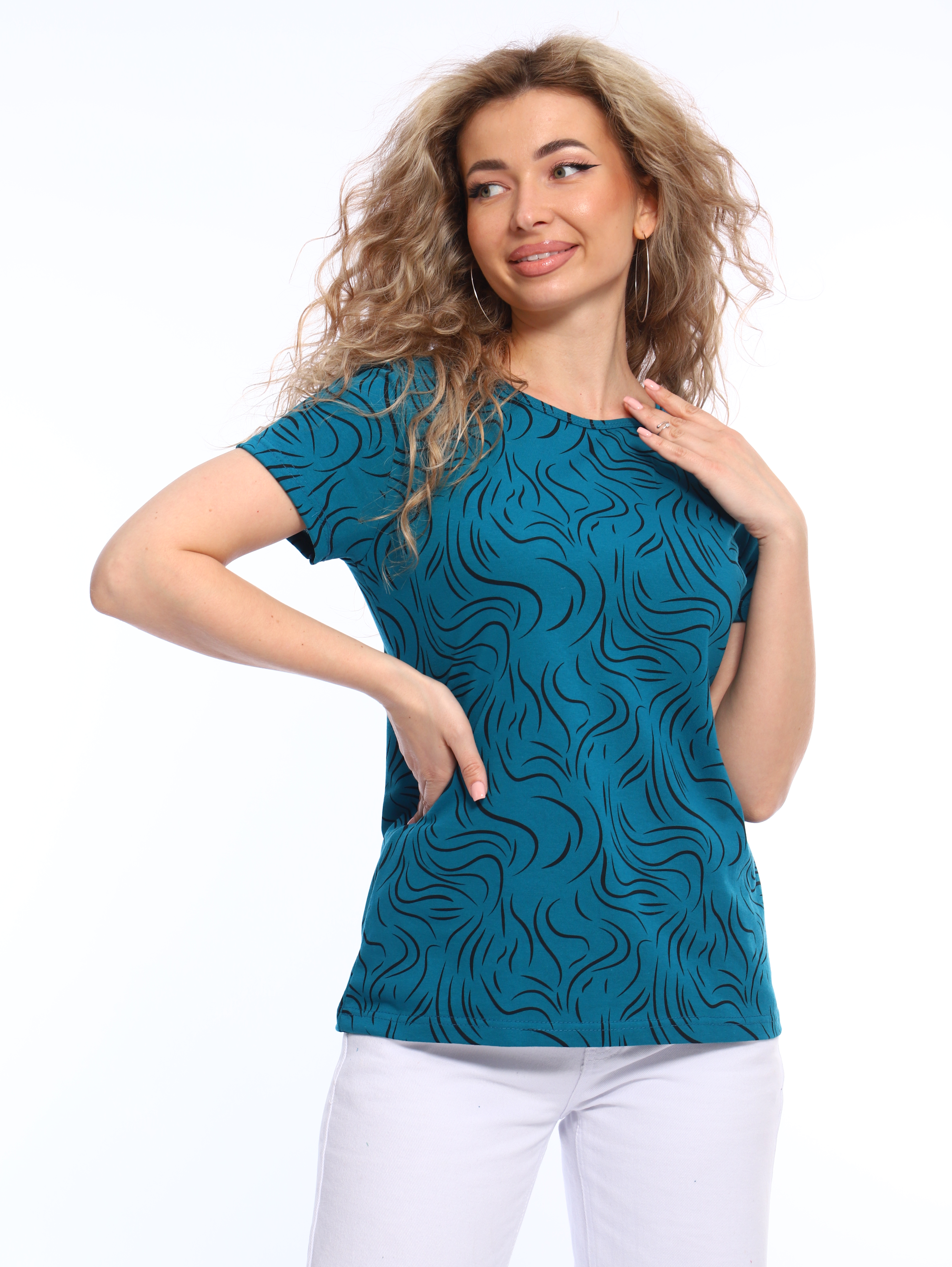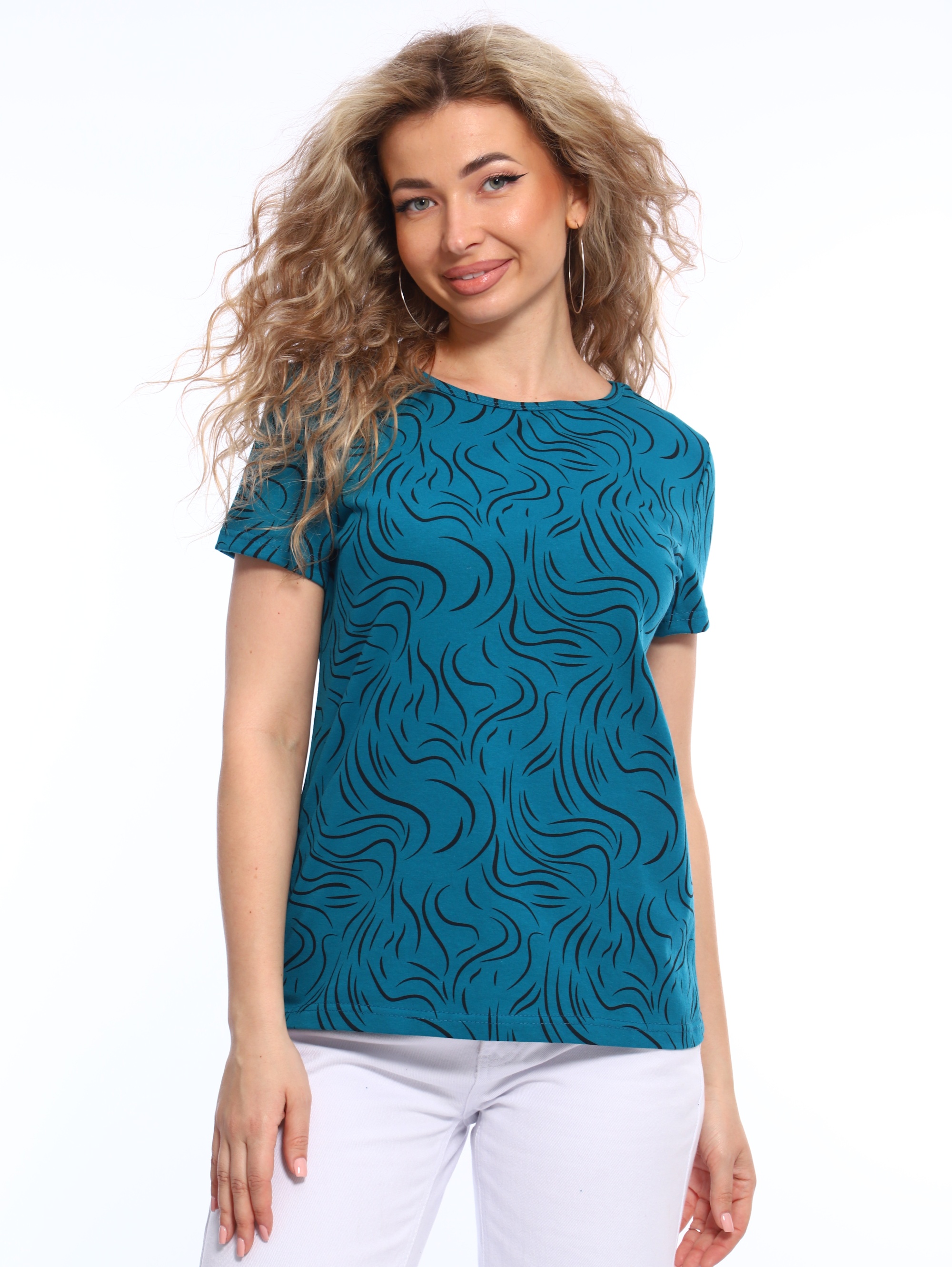 Футболка с красивым, ярким рисунком - это комфортная одежда, которую выбирают для ношения в летний или теплый демисезонный период. У базовой модели из коллекции бренда ТИО прямой полуприлегающий фасон и оптимальная длина, короткие рукава и округлый вырез горловины.